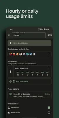 Strictness of each block can be configured, when strict mode is enabled you cannot pause or edit an active restriction, except by rebooting your phone. If that is too easy, you can even prevent a reboot from disabling active blocks in the app's settings. This app uses the Device Administrator permission. The permission can (optionally) be enabled inside the app's settings to prevent the app from being force closed or uninstalled, such that there is no way to circumvent a block. Procrastinators, this app is made for you.