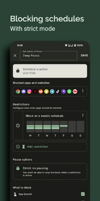 Select a group of apps and create a custom time schedule during which these apps will automatically be blocked. The schedule is fully customizable, allowing you to set different times on different days in the week, allowing you to create productive habits. An active block cannot be turned off so that it prevents you from using distracting apps.